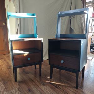 Dancing nightstands. A mishmash of wood preserving walnut veneer on tables and legs