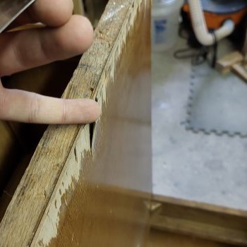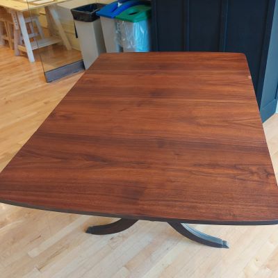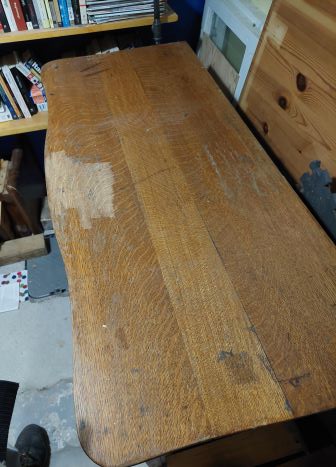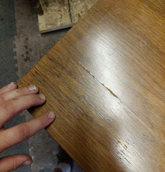 Dated old finish was peeling, significant damage to veneer