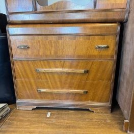 Covered in stain and burn mark, drawer runners destroyed, sitting on the curb heading to landfill